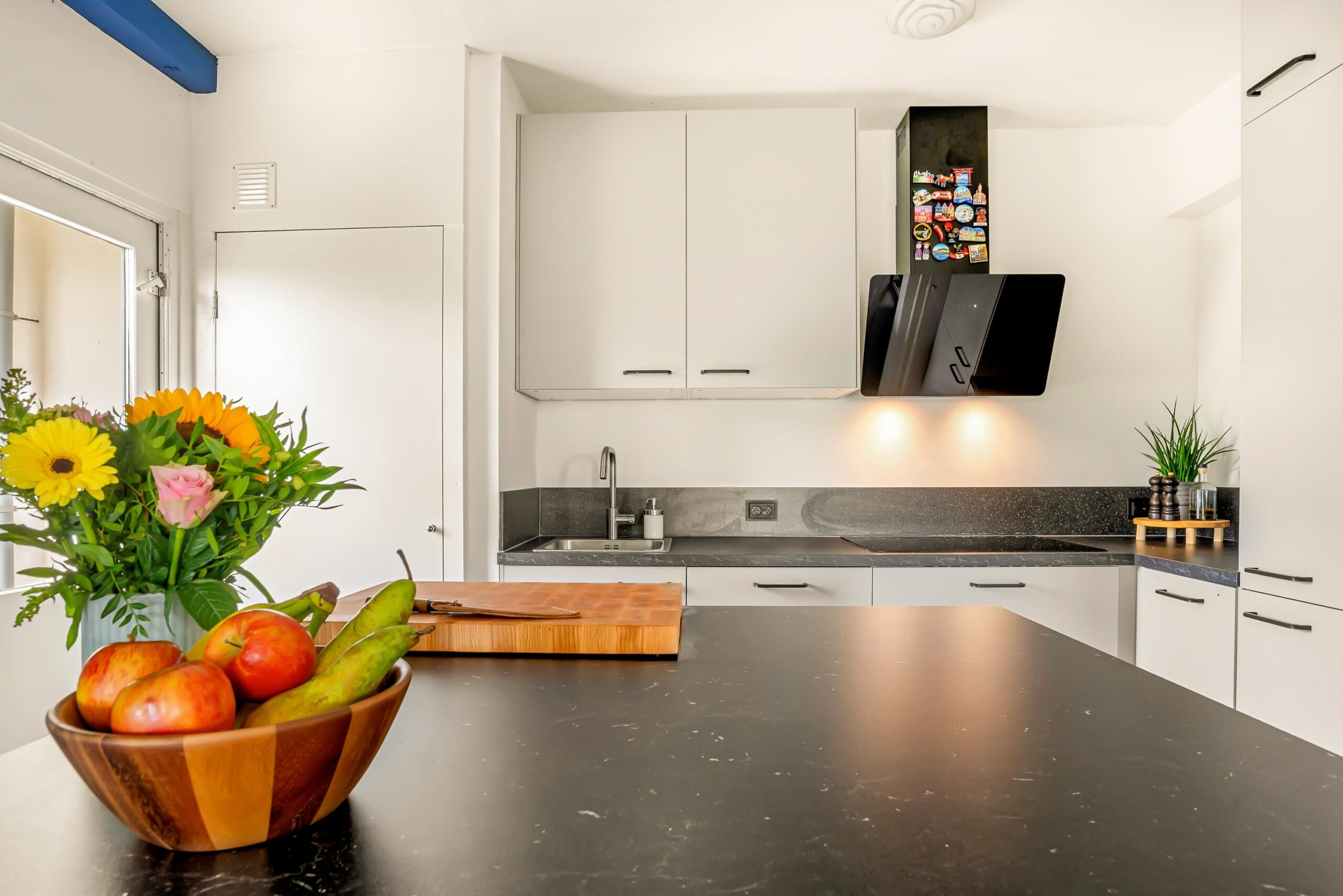 The open-plan kitchen (2025) with its island is a real eye-catcher and equipped with all the modern conveniences you would expect. A bonus: There’s also a separate room for the washing machine and boiler, keeping everything neatly out of sight. The kitchen provides access to the second, smaller balcony.